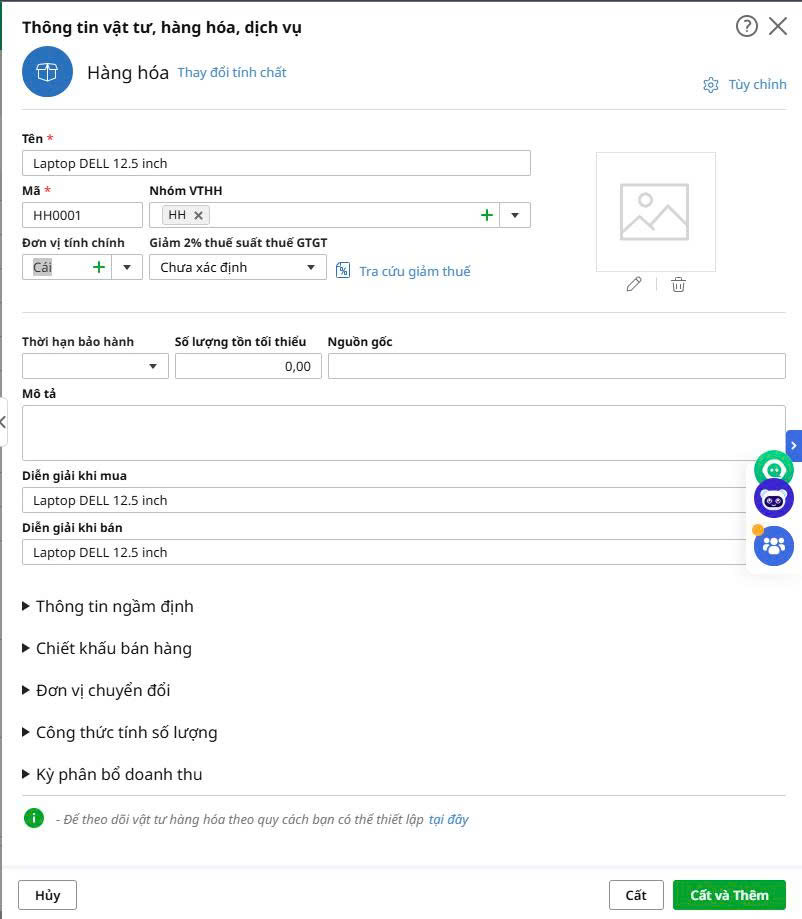 Bước 1: Khai báo Vật tư hàng hóa mới.
