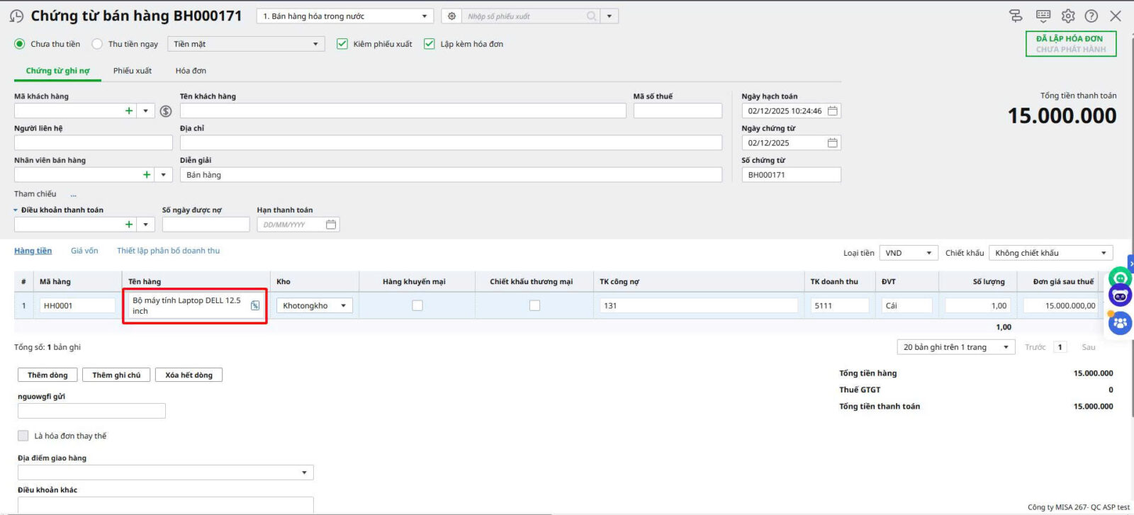 Bước 2: Lập chứng từ bán hàng, Chọn đến VTHH đó, sửa lại tên của vật tư hàng hóa này theo mong muốn của đơn vị hoặc khách hàng. Nhấn Cất