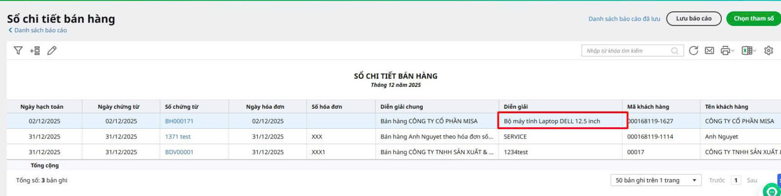- Khi xem sổ chi tiết bán hàng thì các vật tư hàng hóa đã được sửa tên vẫn hiển thị với tên được khai báo trên danh mục vật tư hàng hóa chứ không cập nhật theo tên đã được sửa trên chi tiết chứng từ bán hàng.