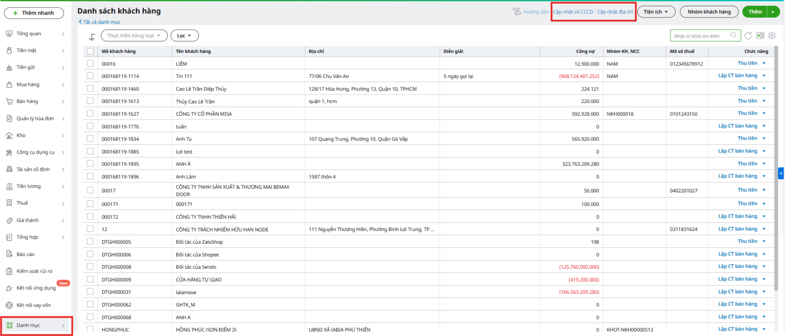Bước 2: Tại danh sách Khách hàng, nhấn Cập nhật địa chỉ trên thanh công cụ