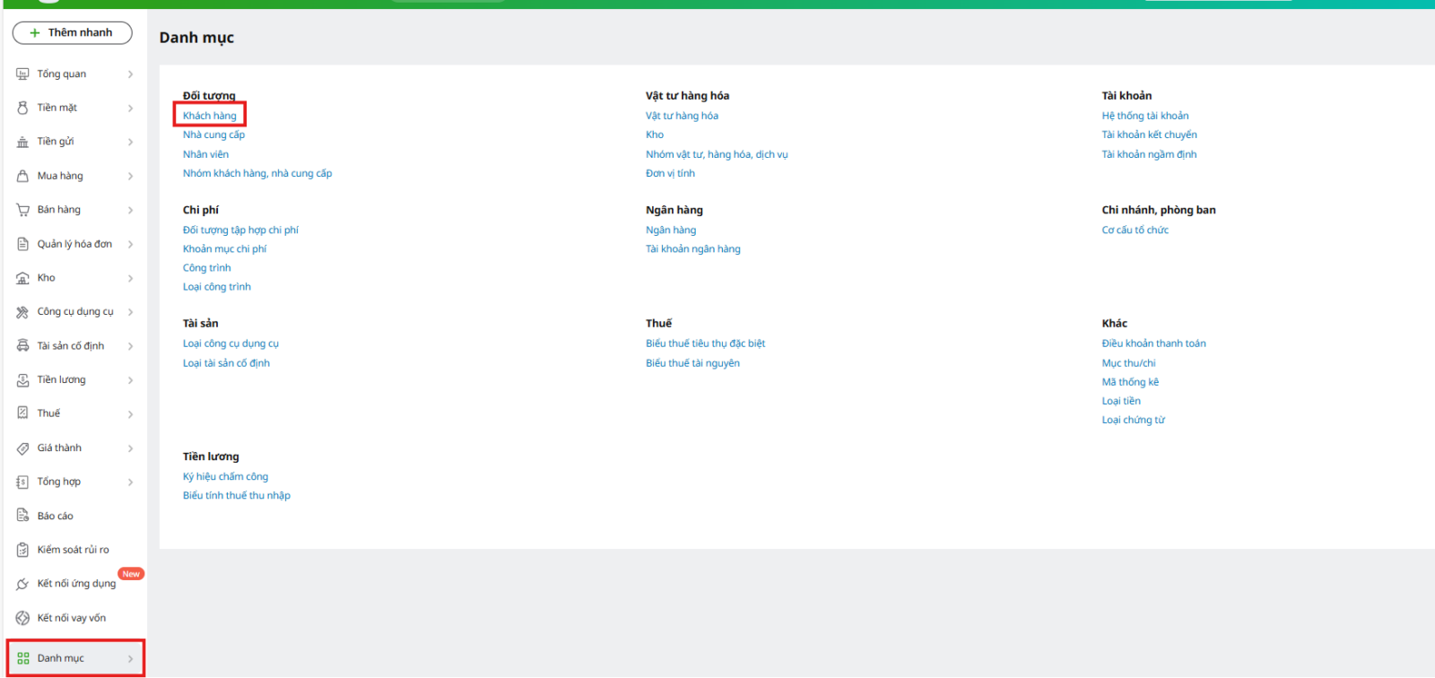 Bước 1: Vào phân hệ Danh mục\tab Đối tượng\chọn mục Khách hàng