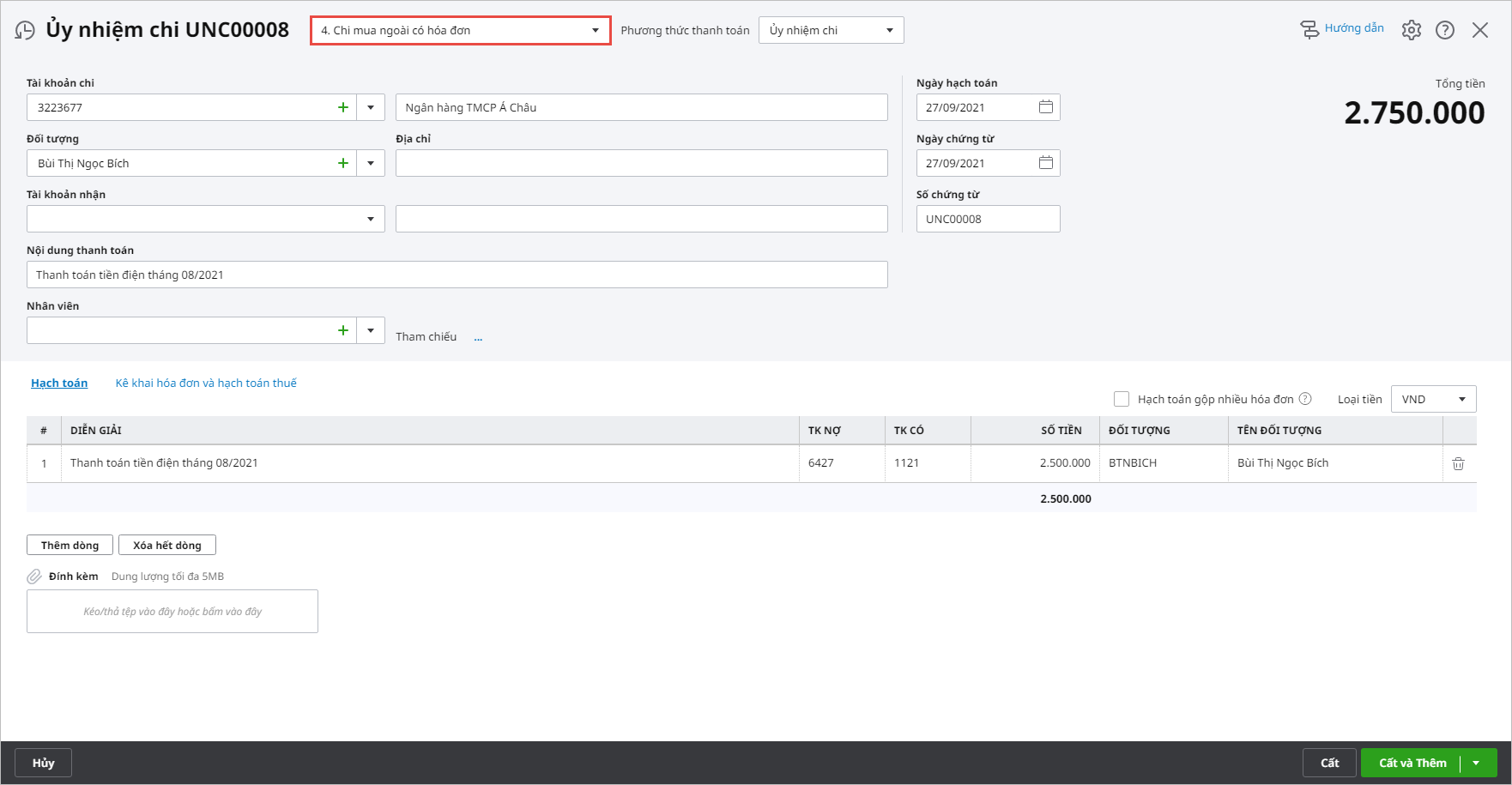- Trường hợp không tích chọn Hạch toán gộp nhiều hóa đơn (áp dụng khi đơn vị hạch toán mỗi phiếu chi tương ứng với một hóa đơn GTGT)