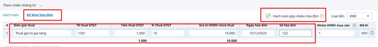 - Các dòng trên tab Hạch toán sẽ độc lập với các dòng trên tab Kê khai hóa đơn.