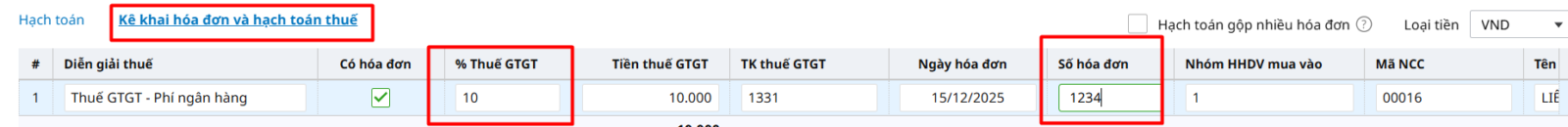Bước 2: Hạch toán chi phí, thuế GTGT và khai báo các thông tin về hóa đơn trên chứng từ