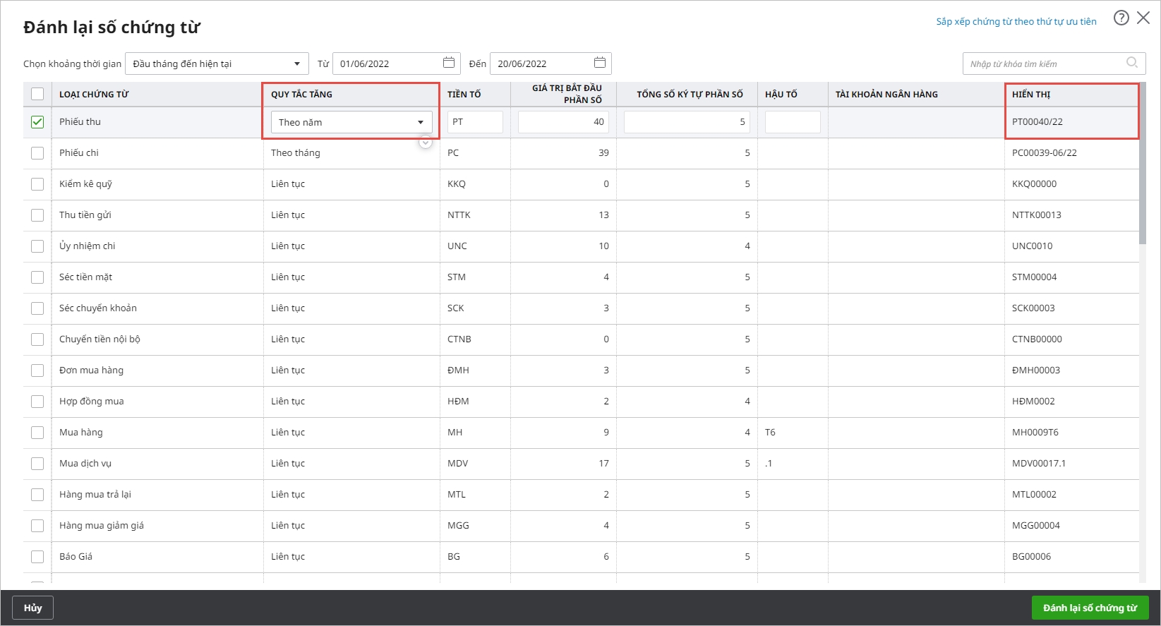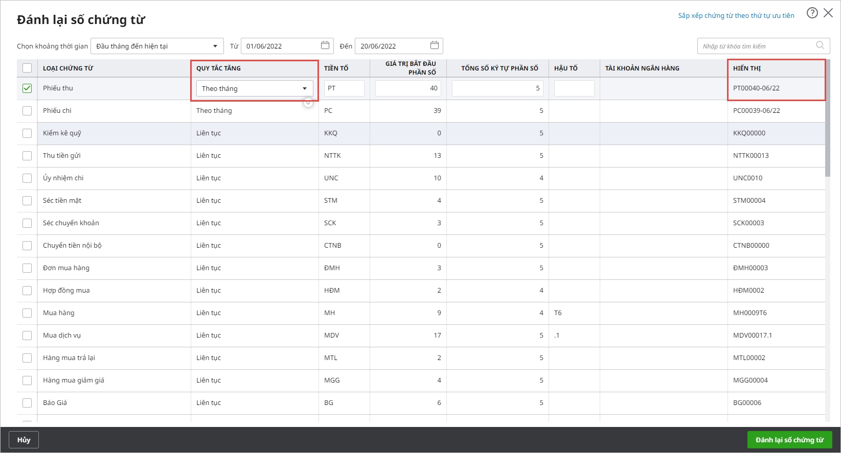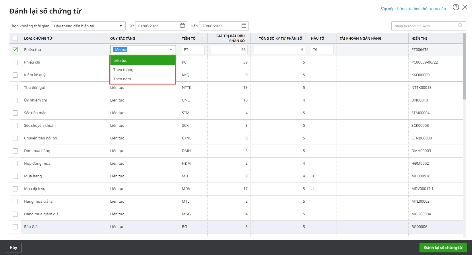 - Thiết lập quy tắc đánh số chứng từ theo liên tục, theo tháng hoặc theo năm