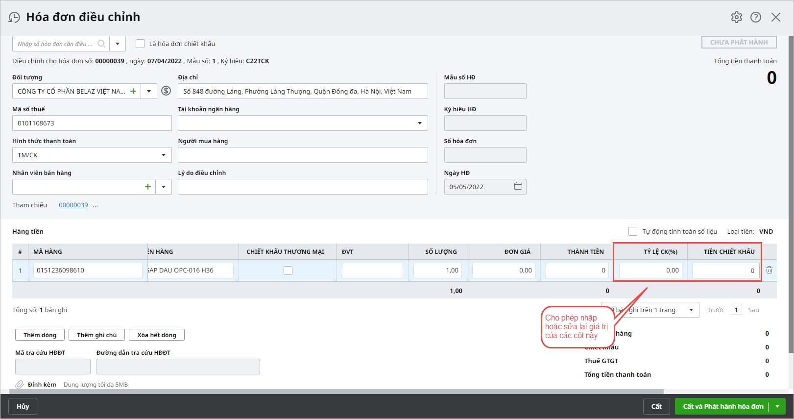 Trên giao diện hóa đơn điều chỉnh theo Nghị định 123/2020/NĐ-CP, chương trình bổ sung các cột: Tỷ lệ CK, Tiền chiết khấu, Tiền chiết khấu quy đổi (Lưu ý: Cột Tiền chiết khấu quy đổi chỉ hiển thị nếu đồng tiền khác đồng tiền hạch toán) và người dùng có thể thực hiện nhập hoặc sửa lại giá trị tại các cột này: