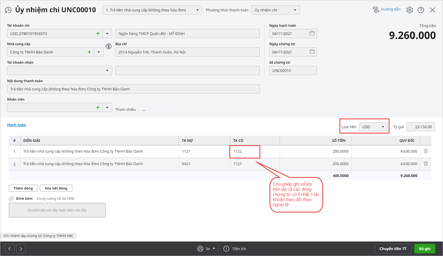 Chương trình cho phép người dùng thực hiện ghi sổ chứng từ trong trường hợp trên chứng từ có loại tiền khác đồng tiền hạch toán, đồng thời trên chứng từ có nhiều dòng hạch toán, trong đó chỉ có 1 tài khoản theo dõi theo ngoại tệ.