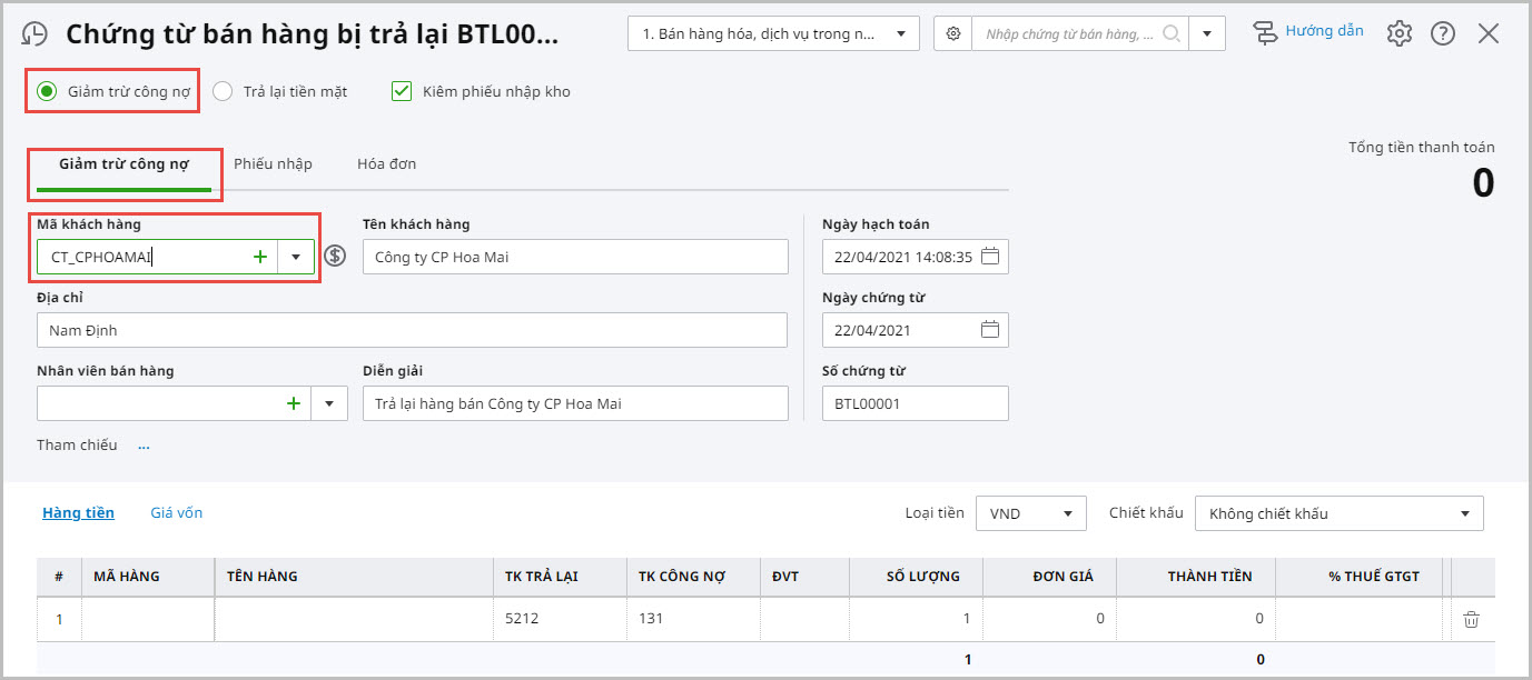 Mục đích: Bài viết hướng dẫn vị trí bổ sung thông tin mã khách hàng trên các giao diện chứng từ liên quan đến hàng bán bị trả lại, giảm trừ công nợ và trả lại tiền mặt.