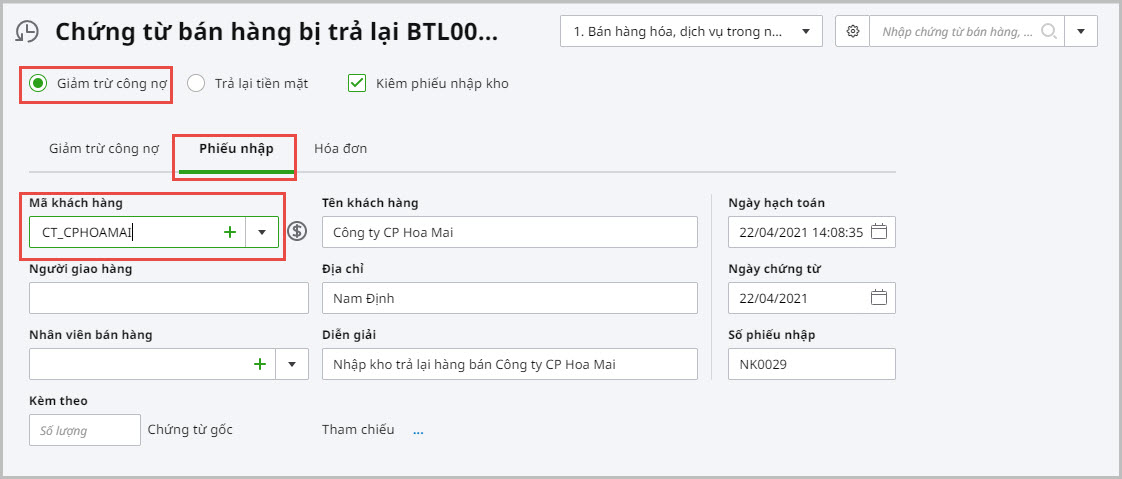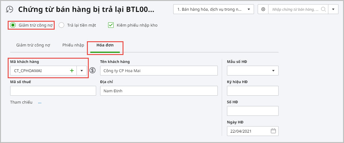 - Vị trí bổ sung mã khách hàng trên chứng từ hàng bán bị trả lại.