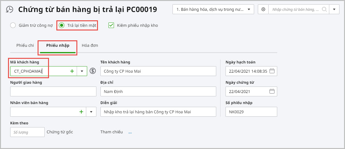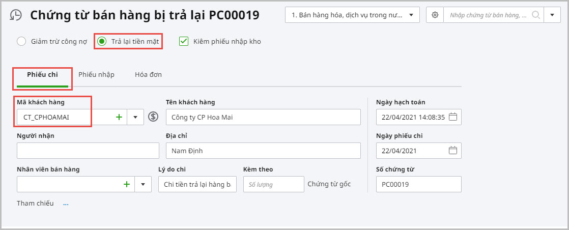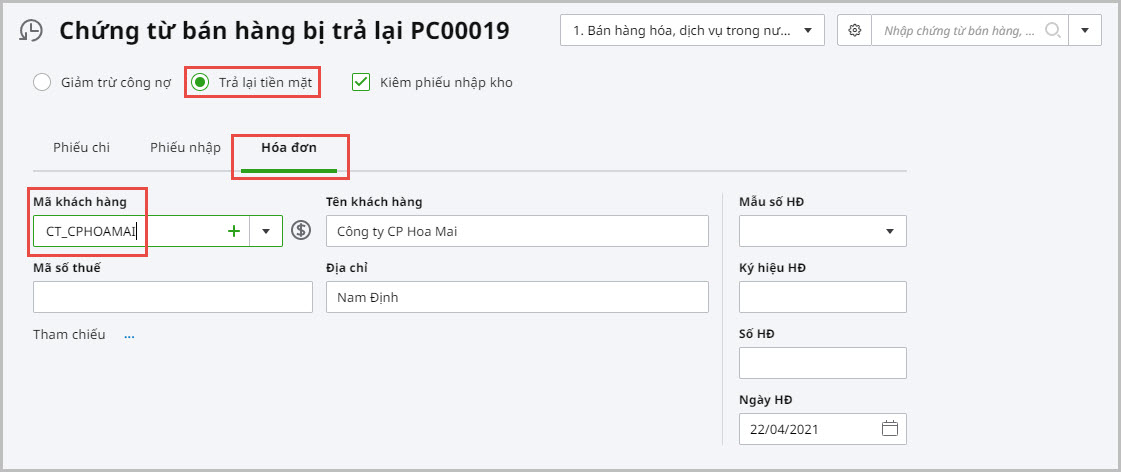 - Vị trí bổ sung mã khách hàng trên chứng từ trả lại tiền mặt.