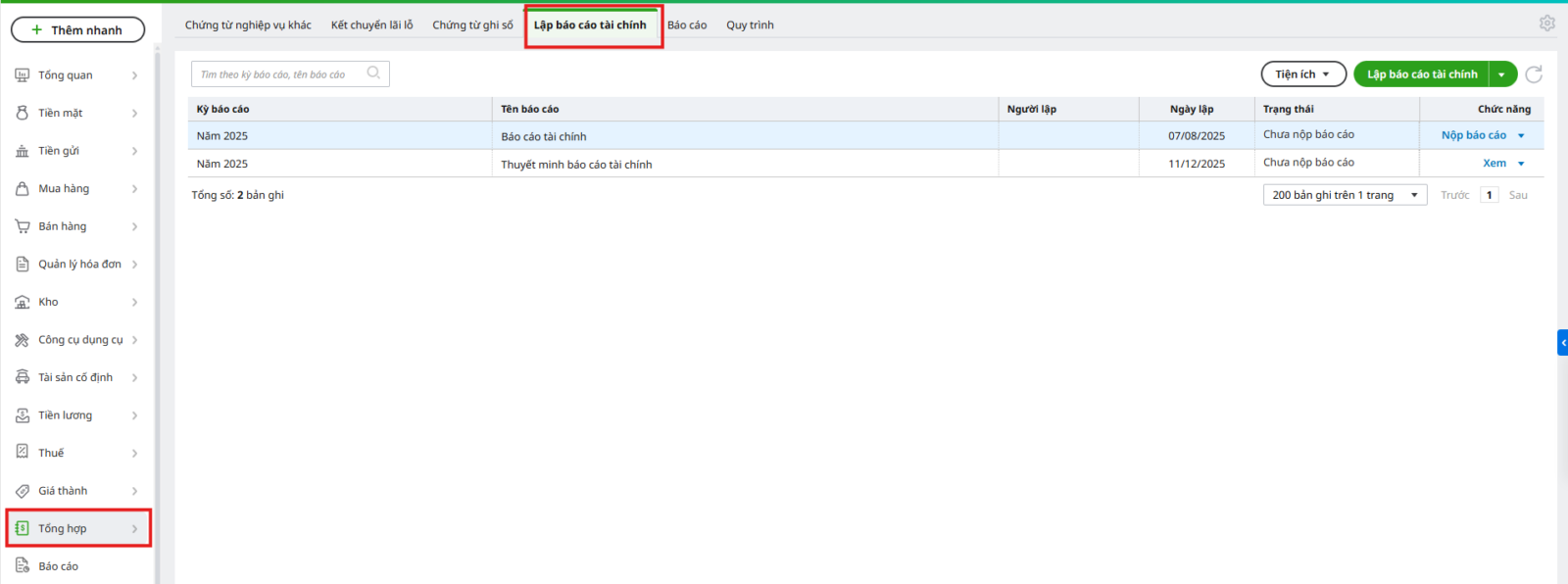 Bước 1: Tại phân hệ Tổng hợp\tab Lập báo cáo tài chính