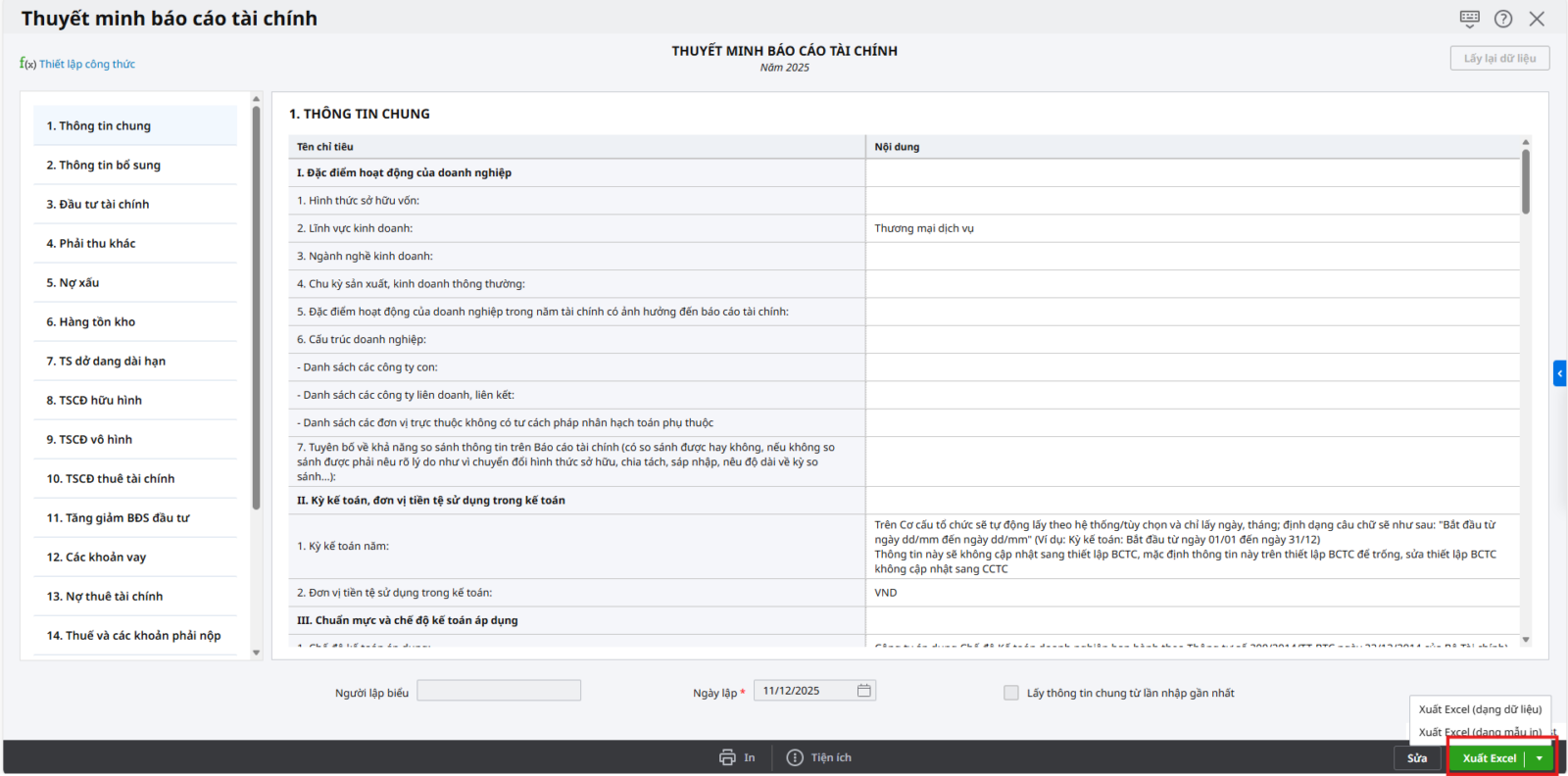 - Hướng dẫn chi tiết các giao diện hỗ trợ xuất thuyết minh BCTC ra file xls.