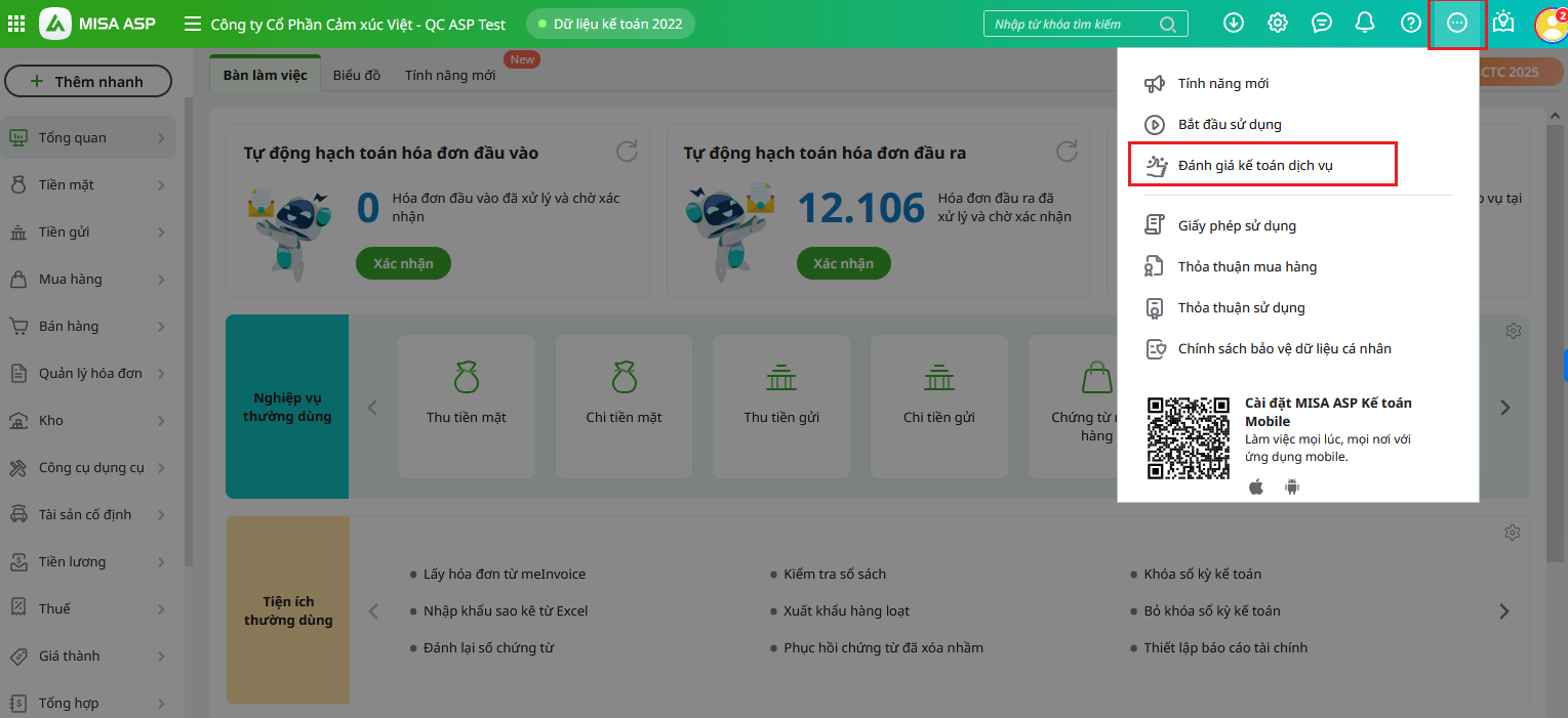 2.1. Chủ doanh nghiệp đánh giá kế toán dịch vụLưu ý: Tính năng chỉ áp dụng cho người dùng là chủ doanh nghiệp hoặc Nhân viên hành chính của doanh nghiệp đăng nhập MISA ASP kế toán từ AMIS Platform. Đánh giá KTDV trên phần mềm MISA ASP kế toán (phiên bản Website) Để thực hiện đánh giá cho đơn vị KTDV, người dùng thực hiện theo các bước sau: Bước 1: Nhấn vào dấu 3 chấm, chọn Đánh giá kế toán dịch vụ