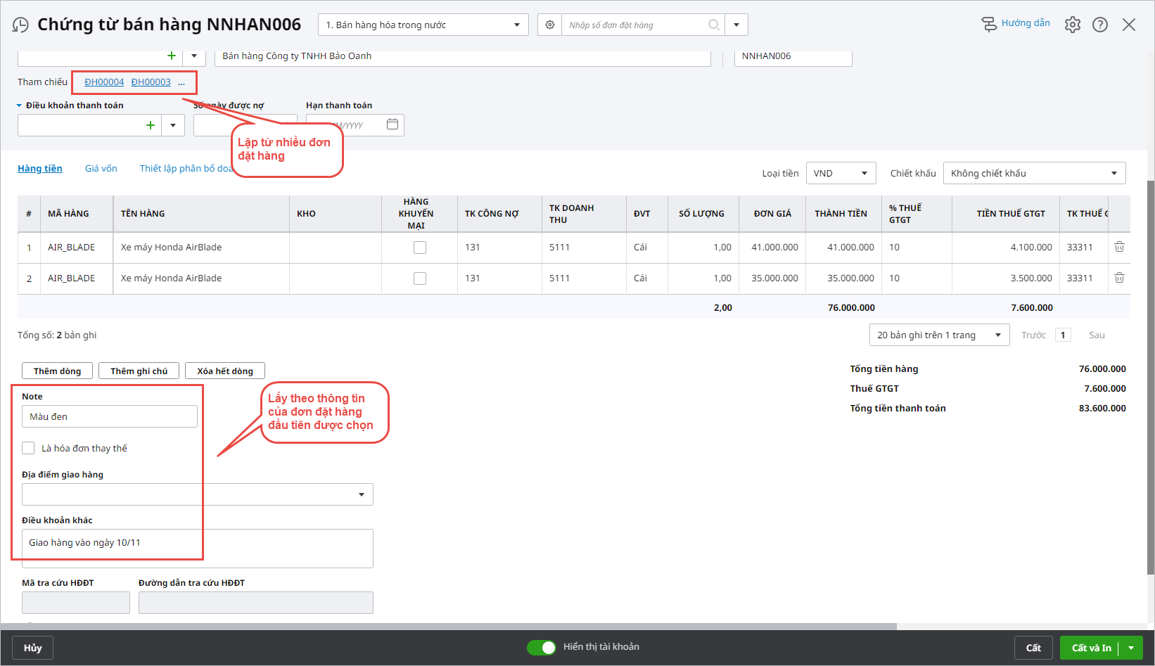 2.2. Lập chứng từ bán hàng từ nhiều đơn đặt hàngKhi lập chứng từ bán hàng từ nhiều đơn đặt hàng, chương trình sẽ tự động lấy thông tin trường mở rộng/điều khoản khác lên chứng từ bán hàng theo thông tin trường mở rộng/điều khoản khác của đơn đặt hàng đầu tiên được chọn.