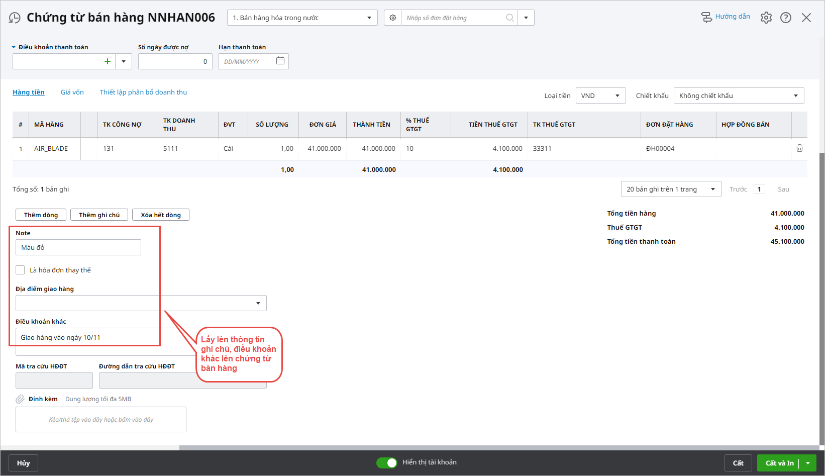 2.1. Lập chứng từ bán hàng từ 1 đơn đặt hàngKhi lập chứng từ bán hàng từ một đơn đặt hàng, chương trình sẽ tự động lấy thông tin trường mở rộng/điều khoản khác lên chứng từ bán hàng theo thông tin trường mở rộng/điều khoản khác trên đơn đặt hàng: