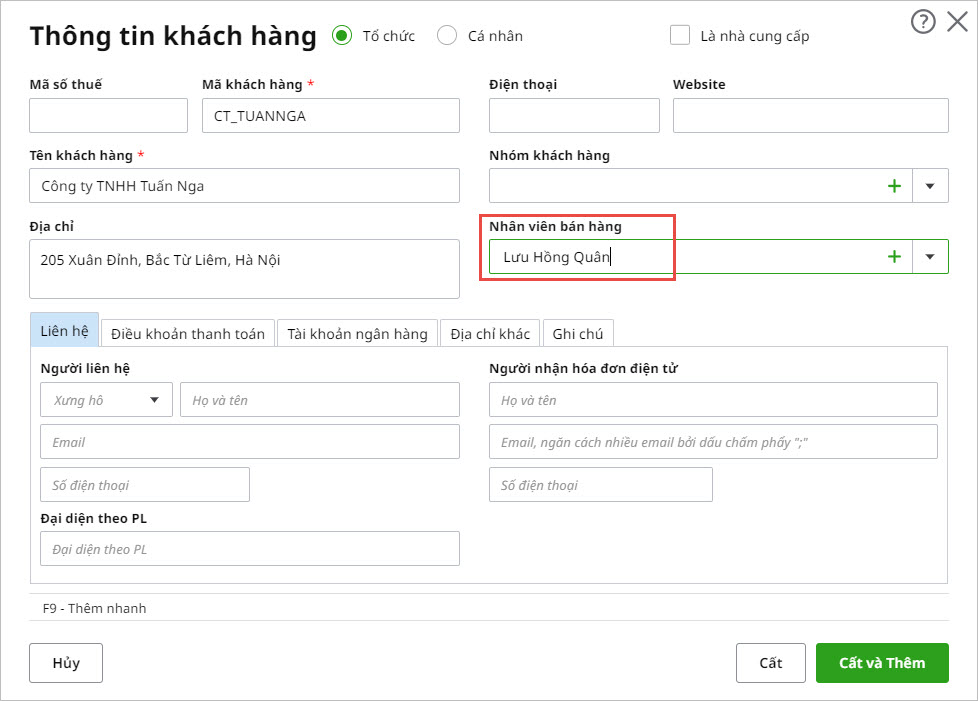 Bước 2. Khai báo nhân viên bán hàng/nhân viên kinh doanh phụ trách khách hàng đó. 2.2 Lập chứng từ thu/chi tiền và hiển thị nhân viên bán hàng