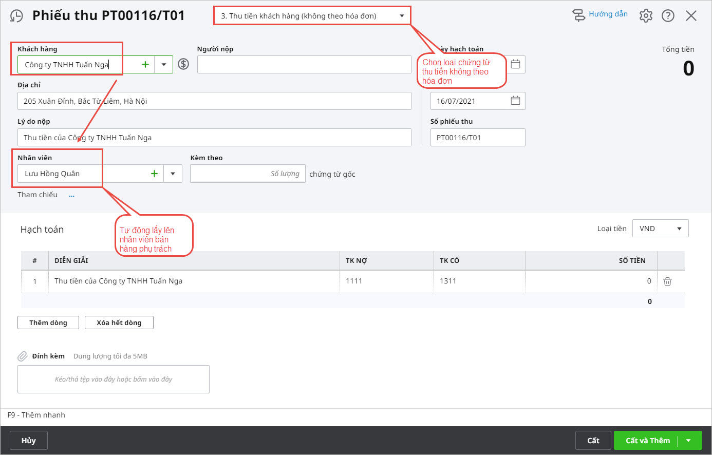 - Lập chứng từ thu/chi tiền mặt, tiền gửi không theo hóa đơn và tự động hiển thị nhân viên bán hàng