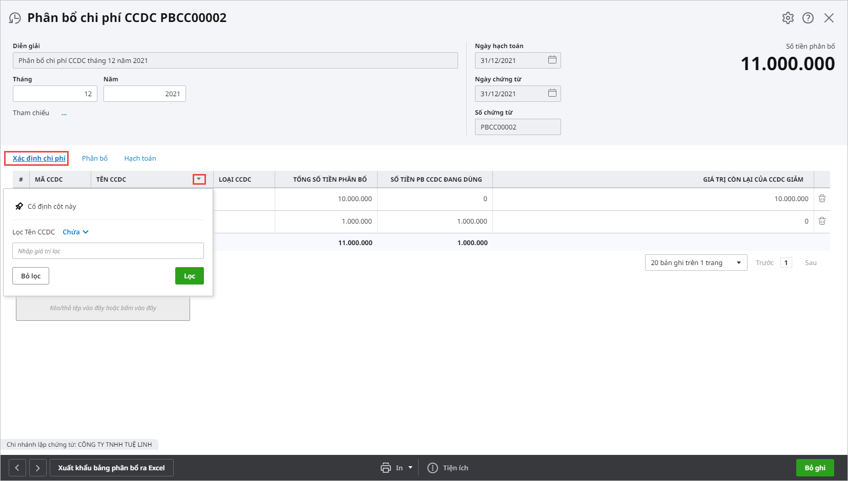 Ví dụ trên chứng từ phân bổ chi phí công cụ dụng cụ:
