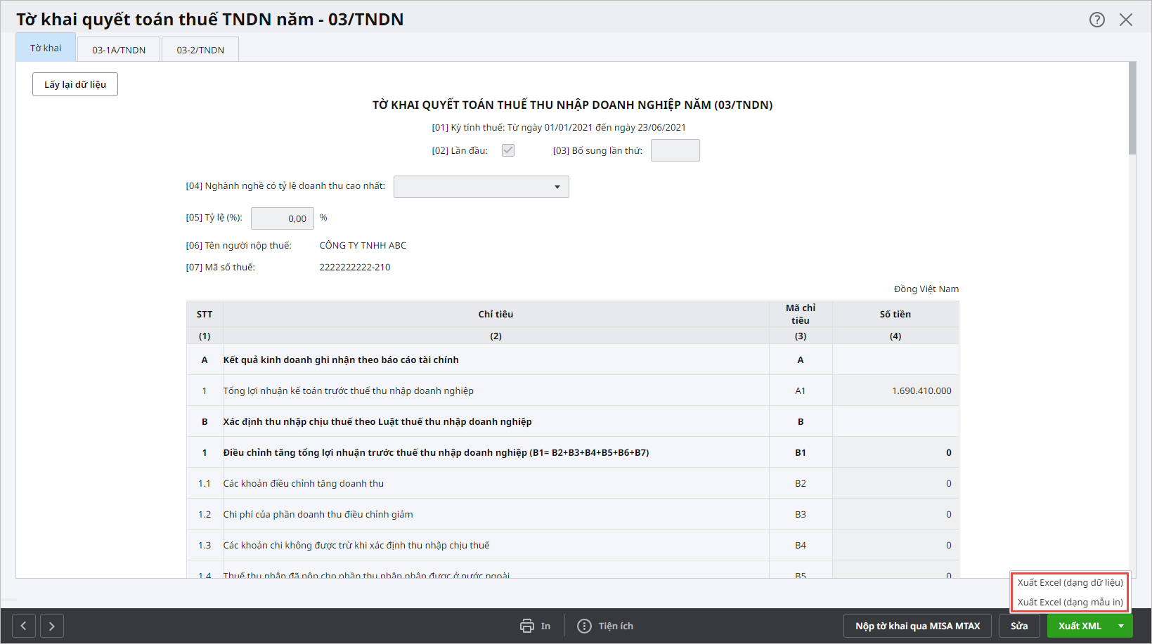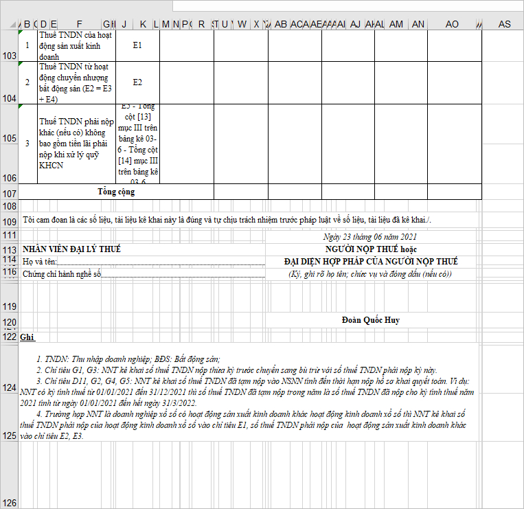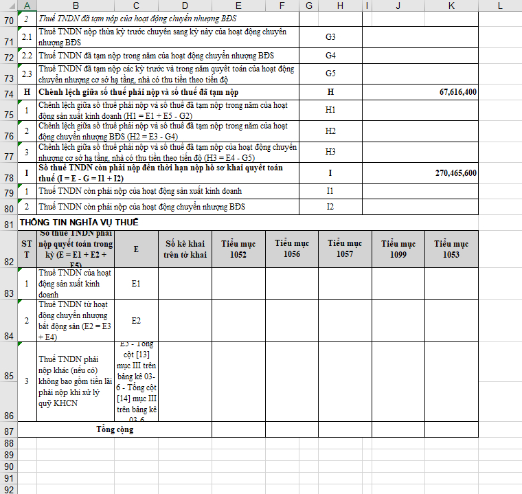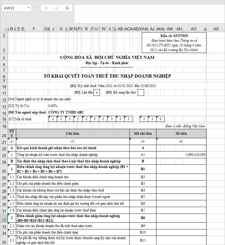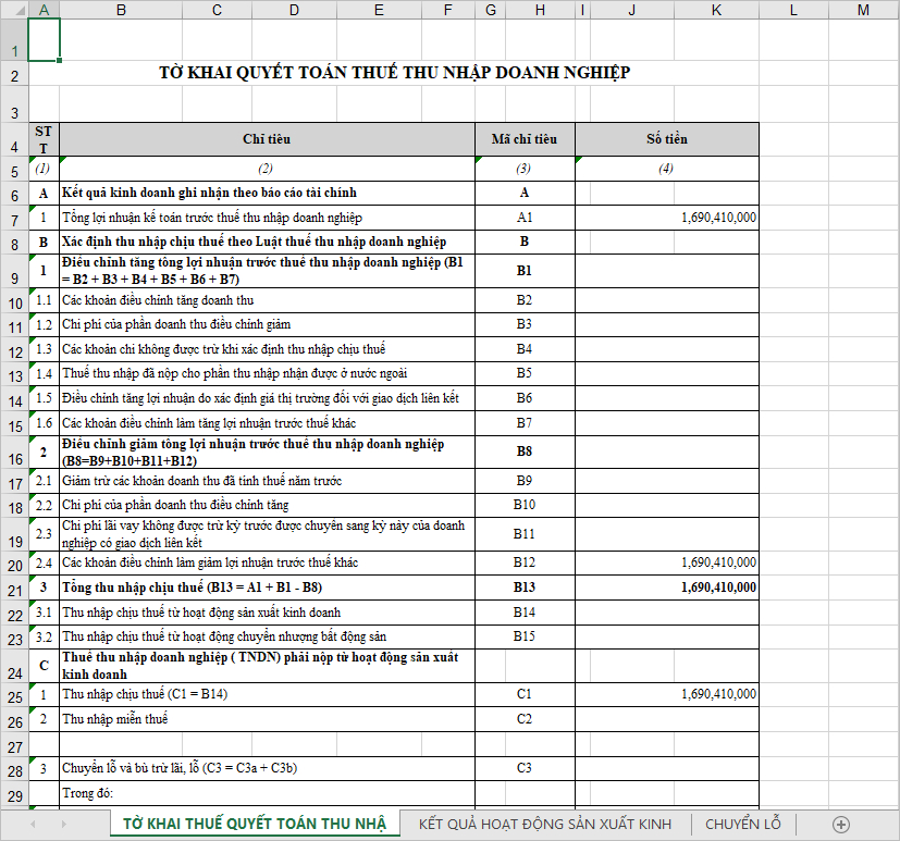 Ví dụ trên tờ khai quyết toán thuế TNDN năm: