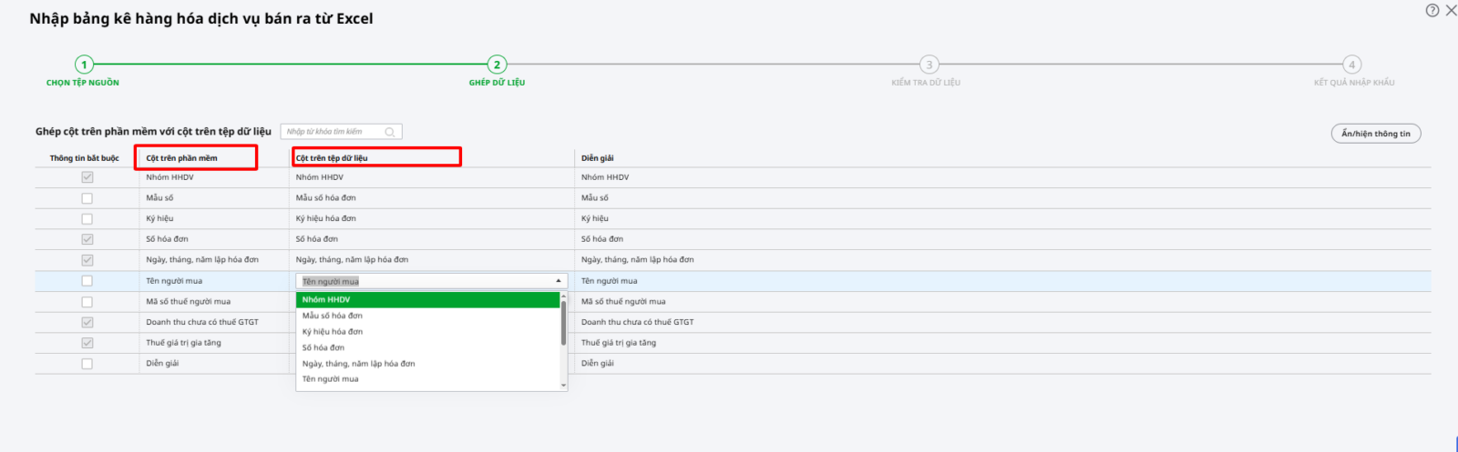 Bước 4Ghép dữ liệu: Tương tự như khi nhập khẩu danh mục có thể ghép được các cột dữ liệu trên file nhập khẩu và trên chương trình