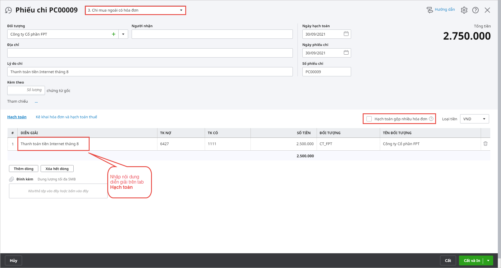 • Phiếu chi (loại Chi mua ngoài có hóa đơn)