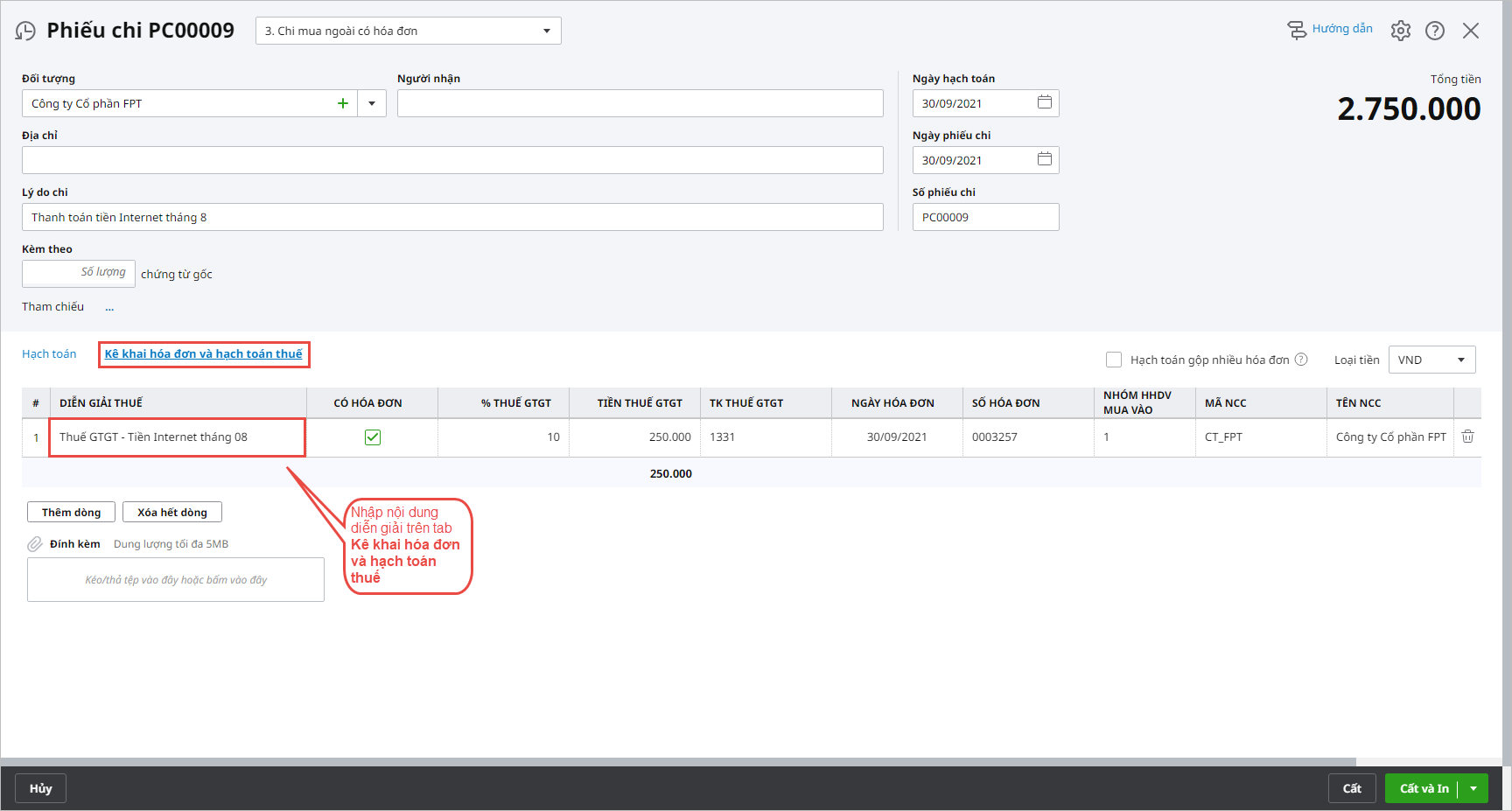 Ví dụ: Trên giao diện Phiếu chi mua ngoài có hóa đơn: