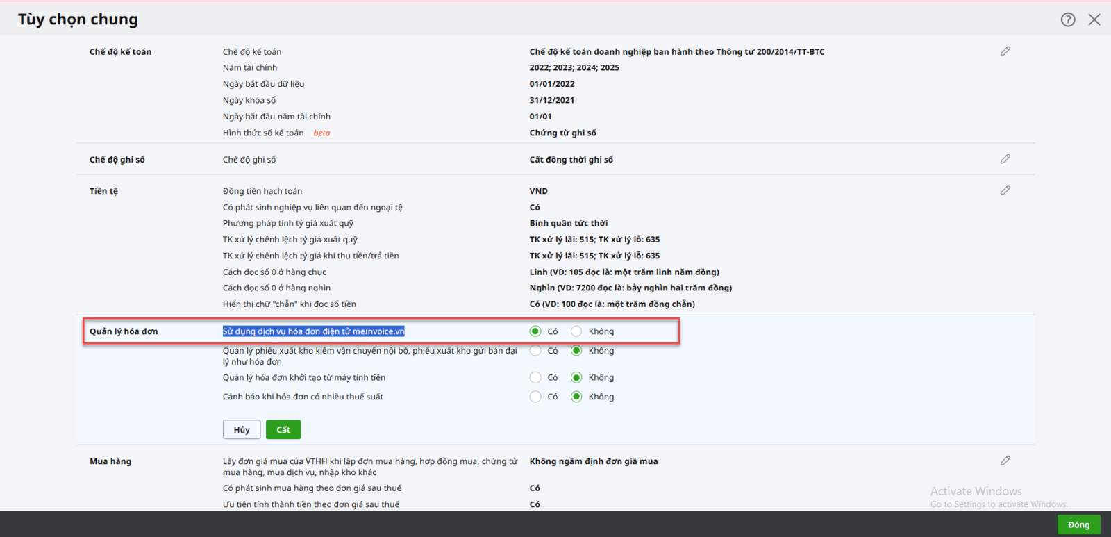 - Kiểm tra tiện ích và thiết lập: Vào tiện ích và thiết lập\Tùy chọn\Tùy chọn chung, tại mục Quản lý hóa đơn đảm bảo đã tích sang Có Sử dụng dịch vụ hóa đơn điện tử meInvoice.vn