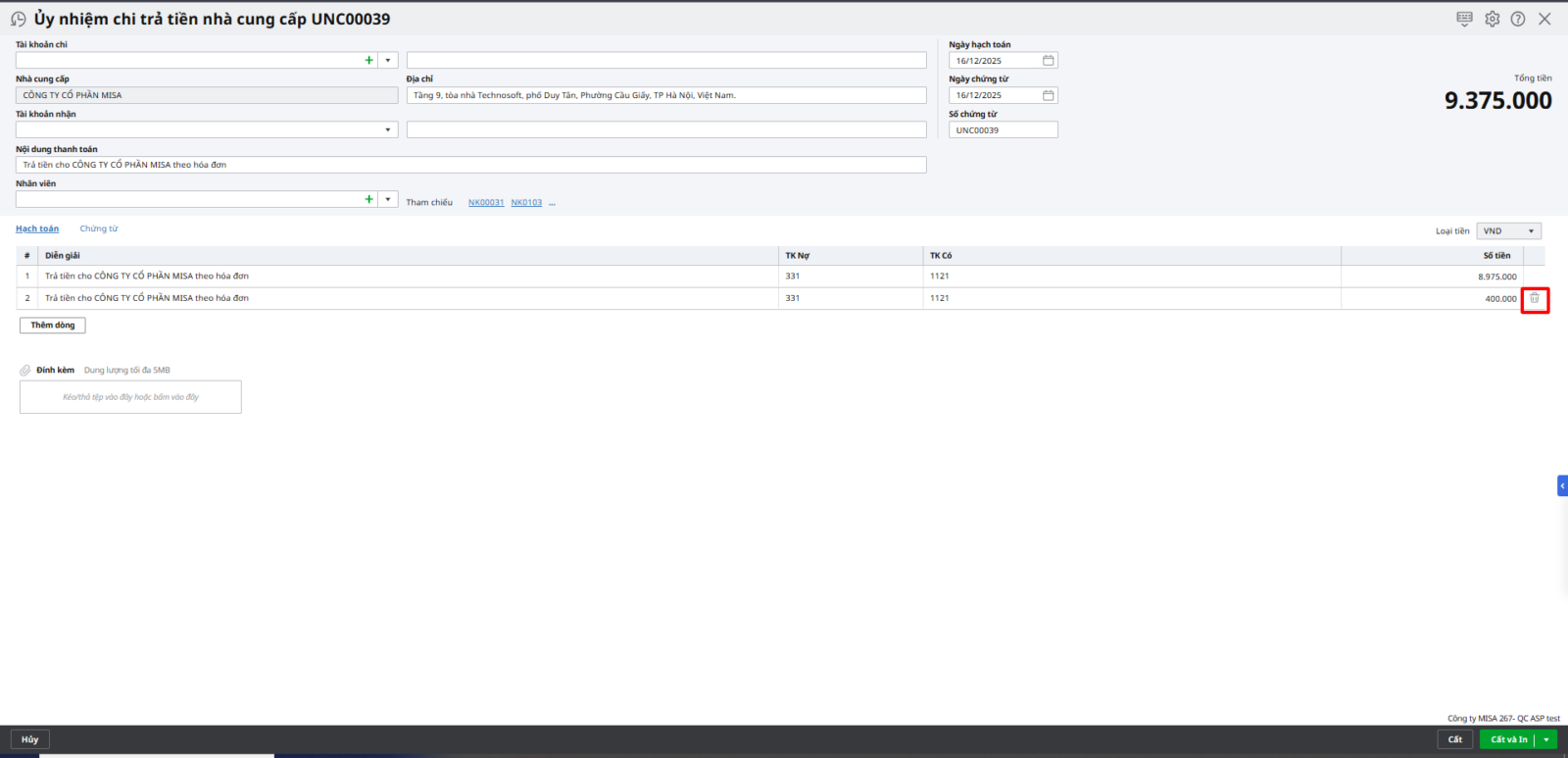 - Trên giao diện chi tiết chứng từ trả tiền theo hóa đơn, chương trình bổ sung chức năng Xóa dòng, Nhấn vào biểu tượng thùng rác🗑️ để xóa dòng: