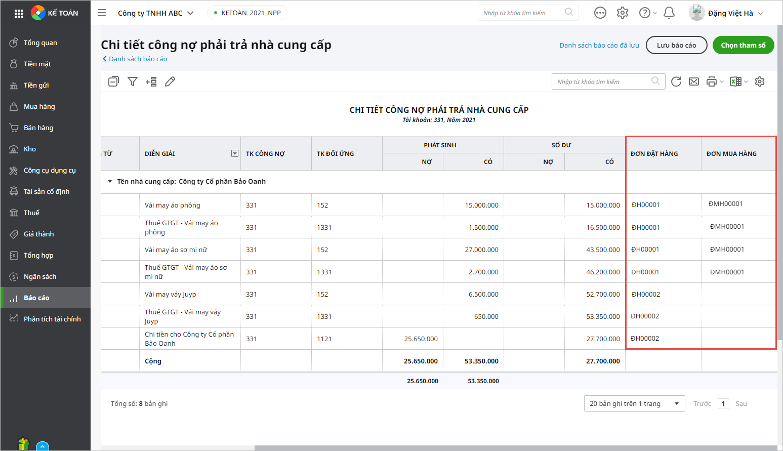 - Trên Sổ chi tiết công nợ phải trả nhà cung cấp bổ sung thêm thông tin đơn đặt hàng và đơn mua hàng: