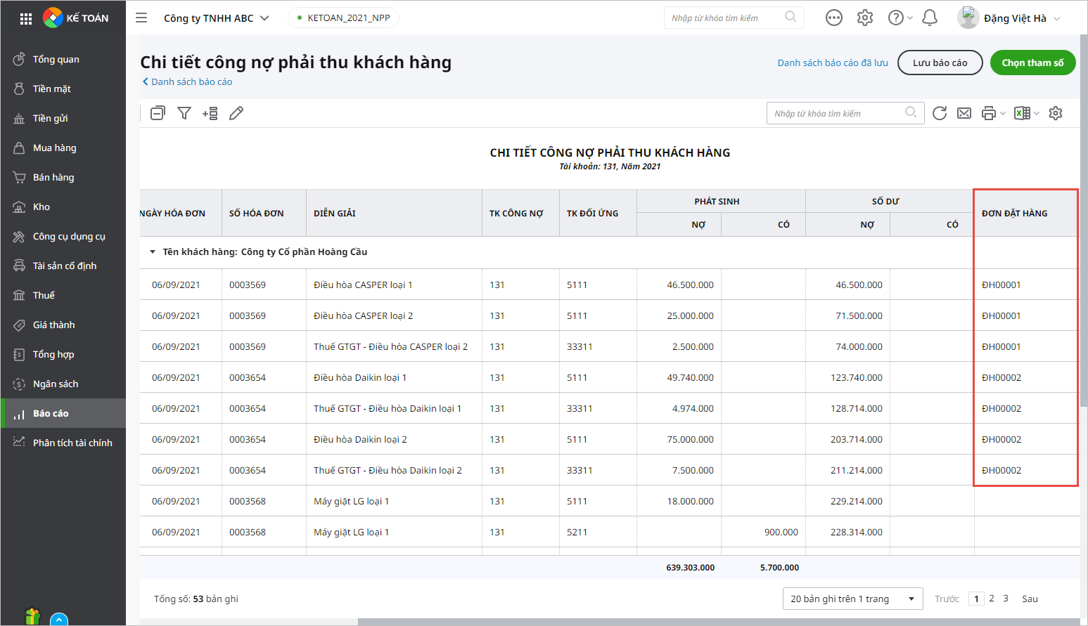 - Trên Sổ chi tiết công nợ phải thu khách hàng bổ sung thêm thông tin đơn đặt hàng: