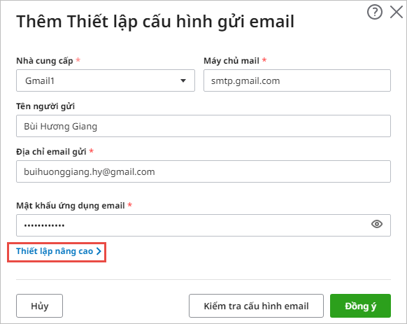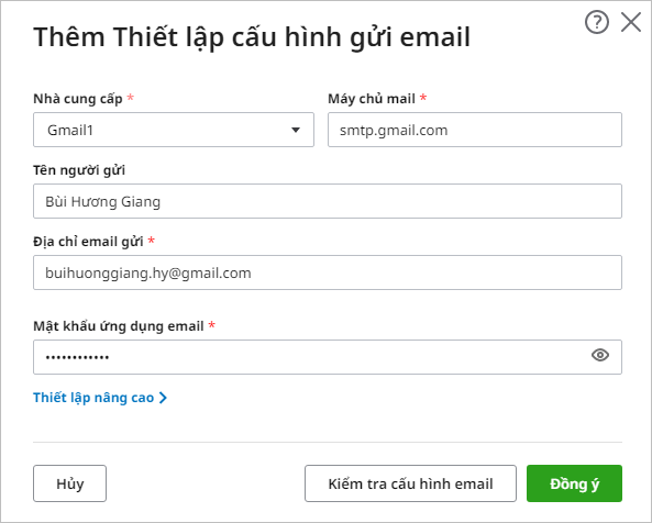 Bước 5: Khai báo các thông tin về cấu hình gửi email, sau đó nhấn Đồng ý.
