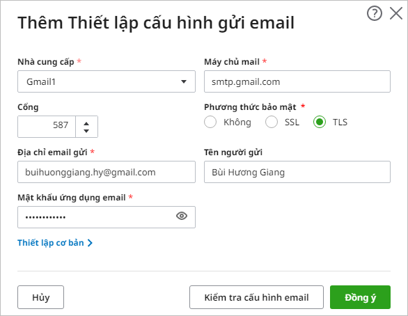 Bước 3: Chương trình sẽ mặc định hiển thị giao diện Thiết lập cơ bản, tại đây khai báo các thông tin email cần thiết lập, sau đó nhấn Đồng ý để thêm Thiết lập cấu hình gửi email.