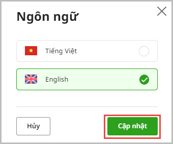 Bước 2: Tích chọn ngôn ngữ English sau đó nhấn Cập nhật.