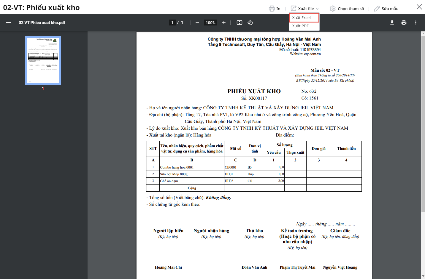 Mục đích: Cho phép xuất các chứng từ ở phân hệ kho ra file Excel theo đúng định dạng in, giúp người dùng chỉnh sửa thông tin trên chứng từ nhanh chóng, thuận tiện.