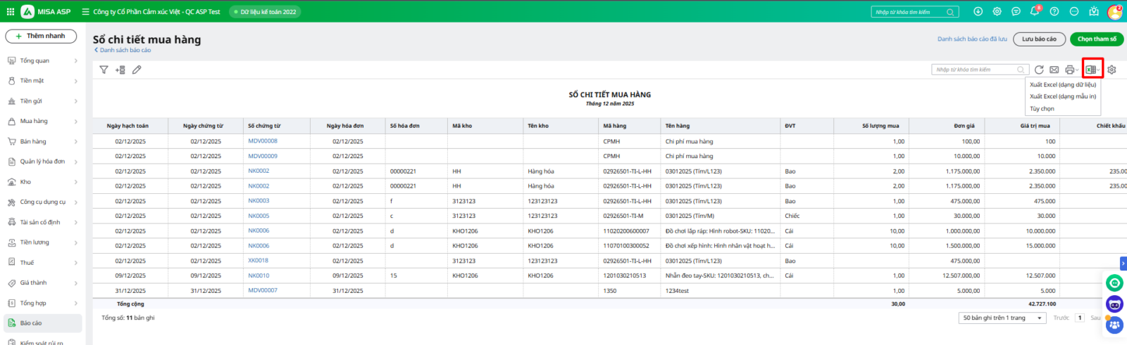 Mục đích: Bài viết hướng dẫn cách xuất dữ liệu báo cáo ra file Excel với đầy đủ thông tin, giúp đáp ứng nhu cầu lưu trữ và chia sẻ dữ liệu theo định dạng mong muốn của người dùng.