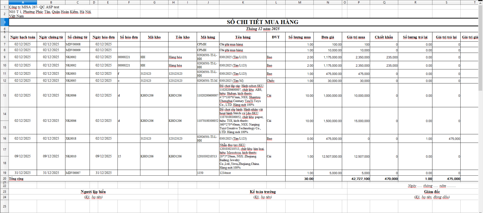 - Nếu người dùng chọn Xuất Excel (dạng mẫu in): File Excel được xuất khẩu ra sẽ lấy lên được đầy đủ các thông tin công ty, phần chân chữ ký như trên chương trình.