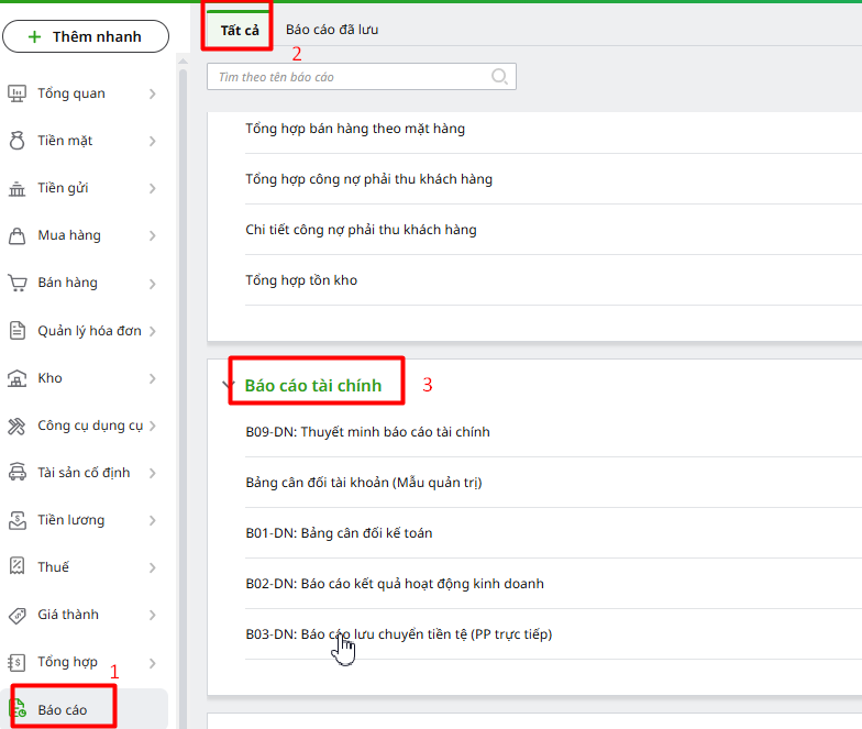 Bước 1. Vào Báo cáo/tất cả -> Báo cáo tài chính