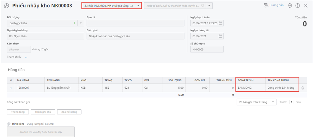Bước 2: Xuất kho NVL sử dụng cho công trình