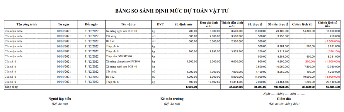 Bước 3: Bảng so sánh dự toán định mức vật tư