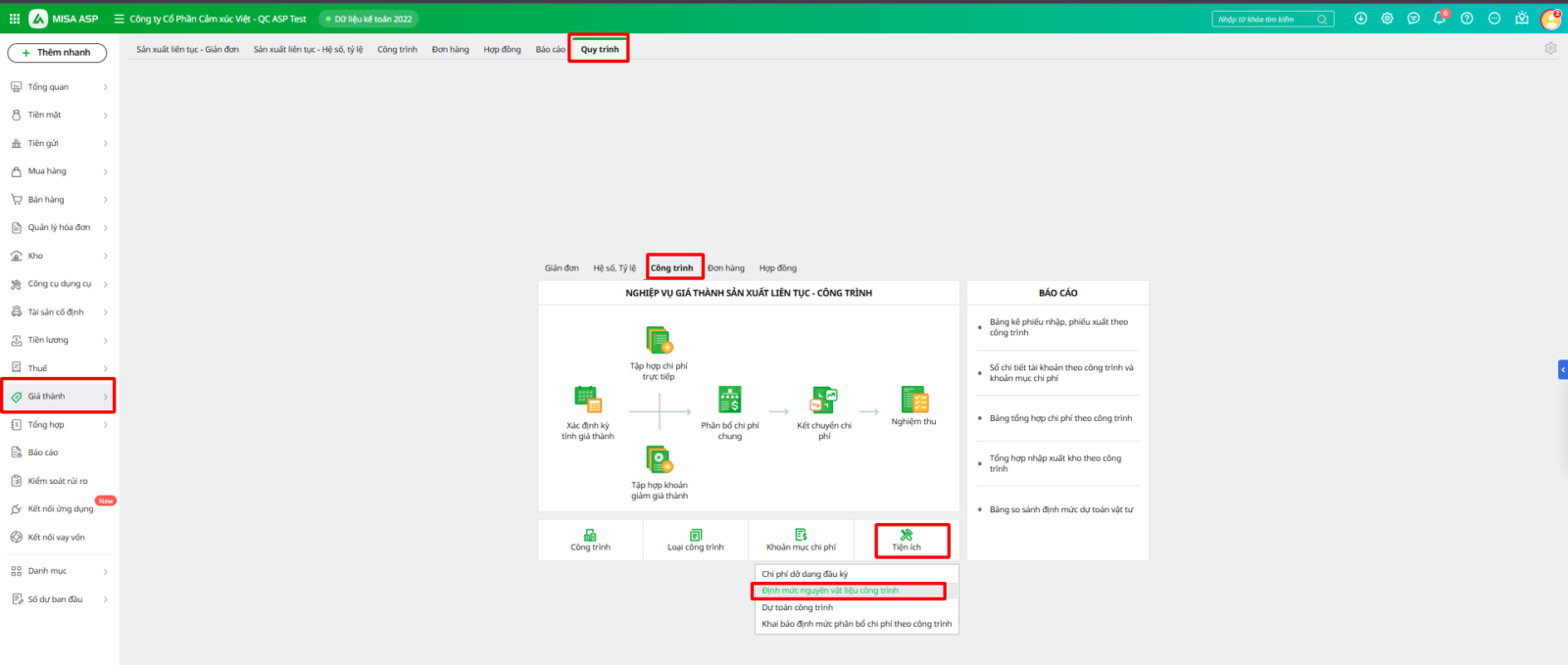 • Vào phân hệ Giá thành\ Quy trình\Công trình\ Tiện ích\ chọn Định mức nguyên vật liệu công trình.