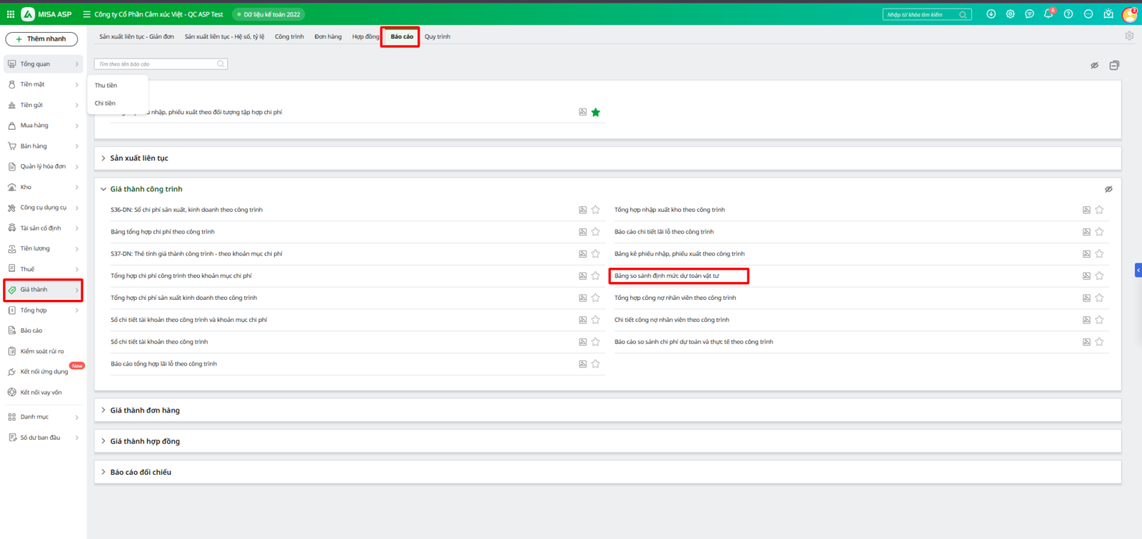• Vào phân hệ Giá thành, tab Báo cáo, chọn Bảng so sánh định mức dự toán vật tư: