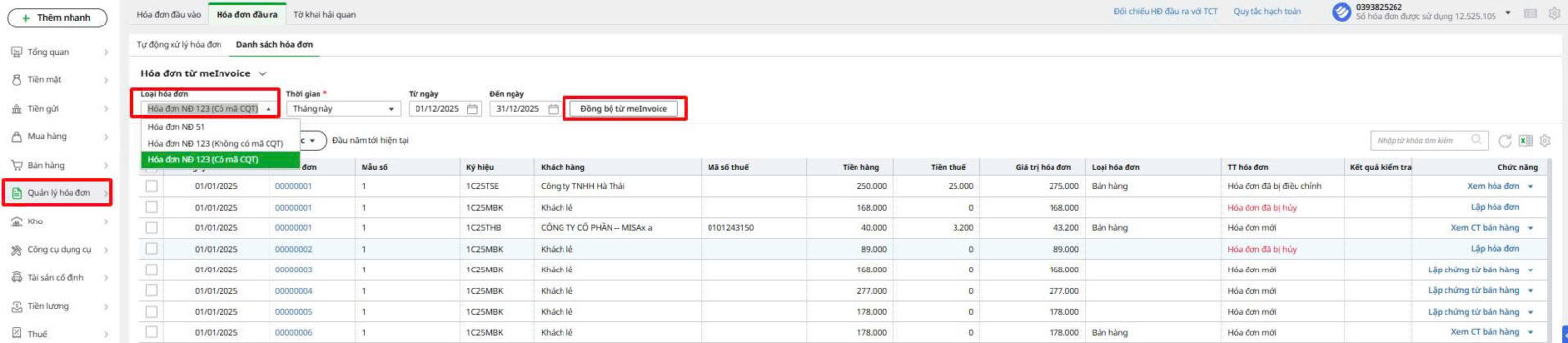 Bước 2: Chương trình chuyển sang giao diện Quản lý hóa đơn/ Hóa đơn đầu ra, Chọn loại hóa đơn là Hóa đơn NĐ123 (Có mã hoặc Không có mã CQT tùy theo nhu cầu của đơn vị).