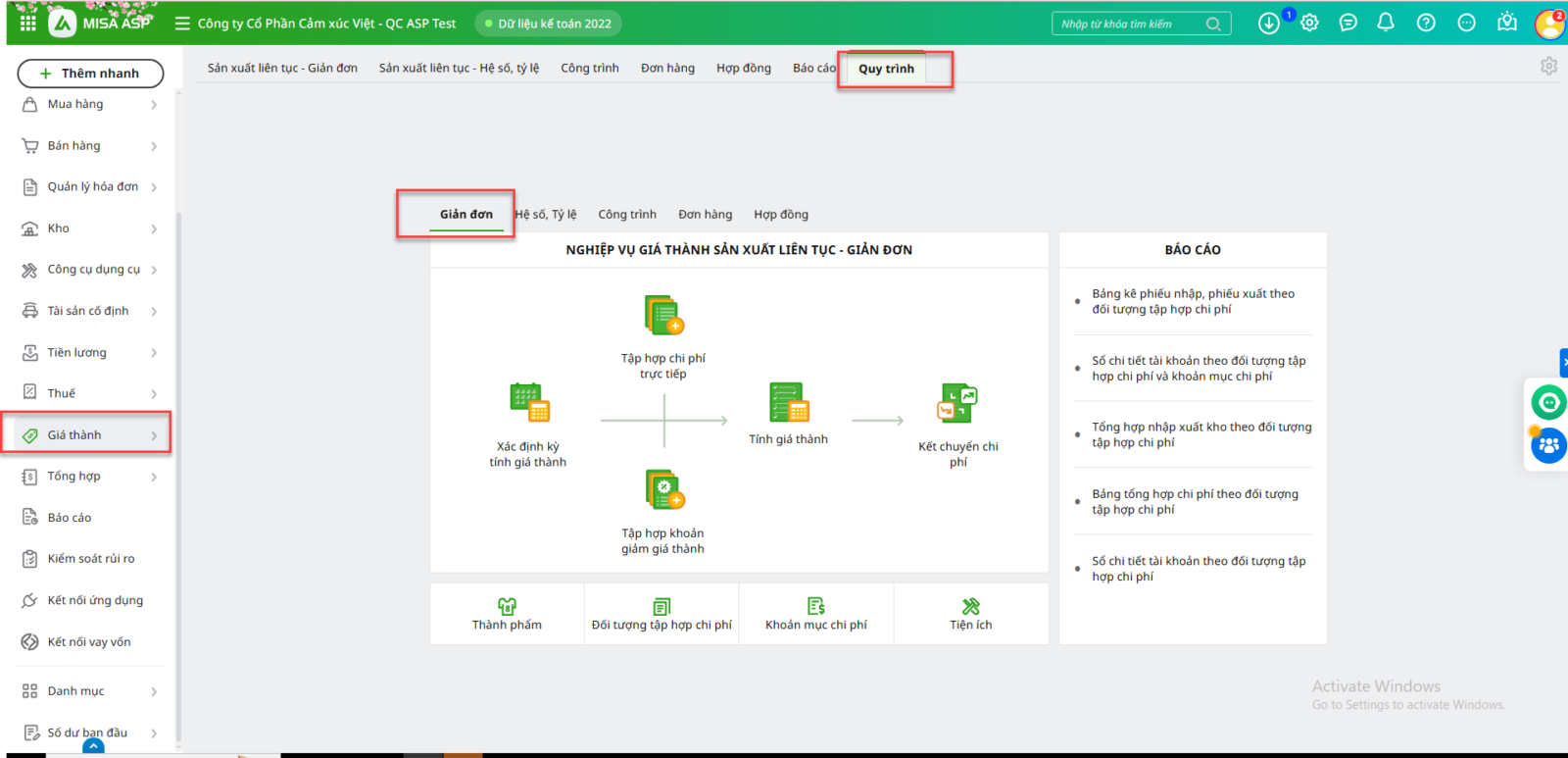 Phần mềm cho phép tính giá thành theo phương pháp giản đơn theo hai Chế độ kế toán sau: