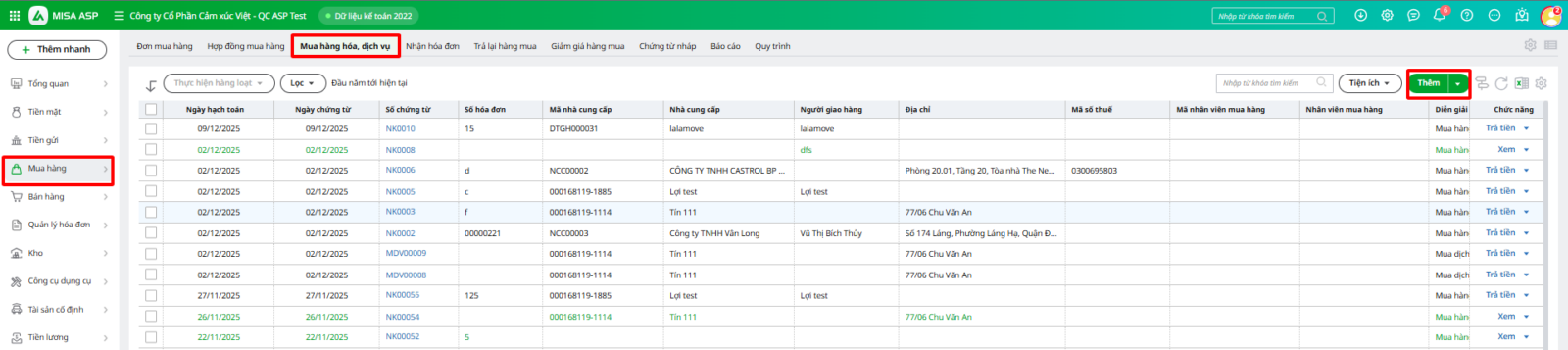 Bước 2: Vào phân hệ Mua hàng, tab Mua hàng hóa, dịch vụ, chọn Thêm Chứng từ mua hàng.