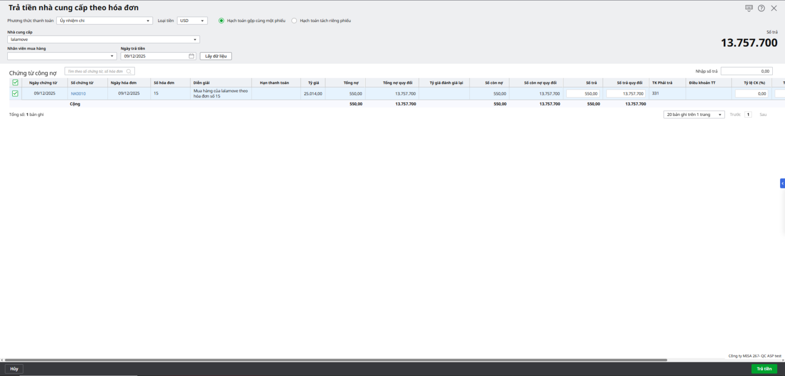 Bước 2: Khai báo các thông tin của chứng từ trả tiền nhà cung cấp theo hóa đơn, nhấn Trả tiền: