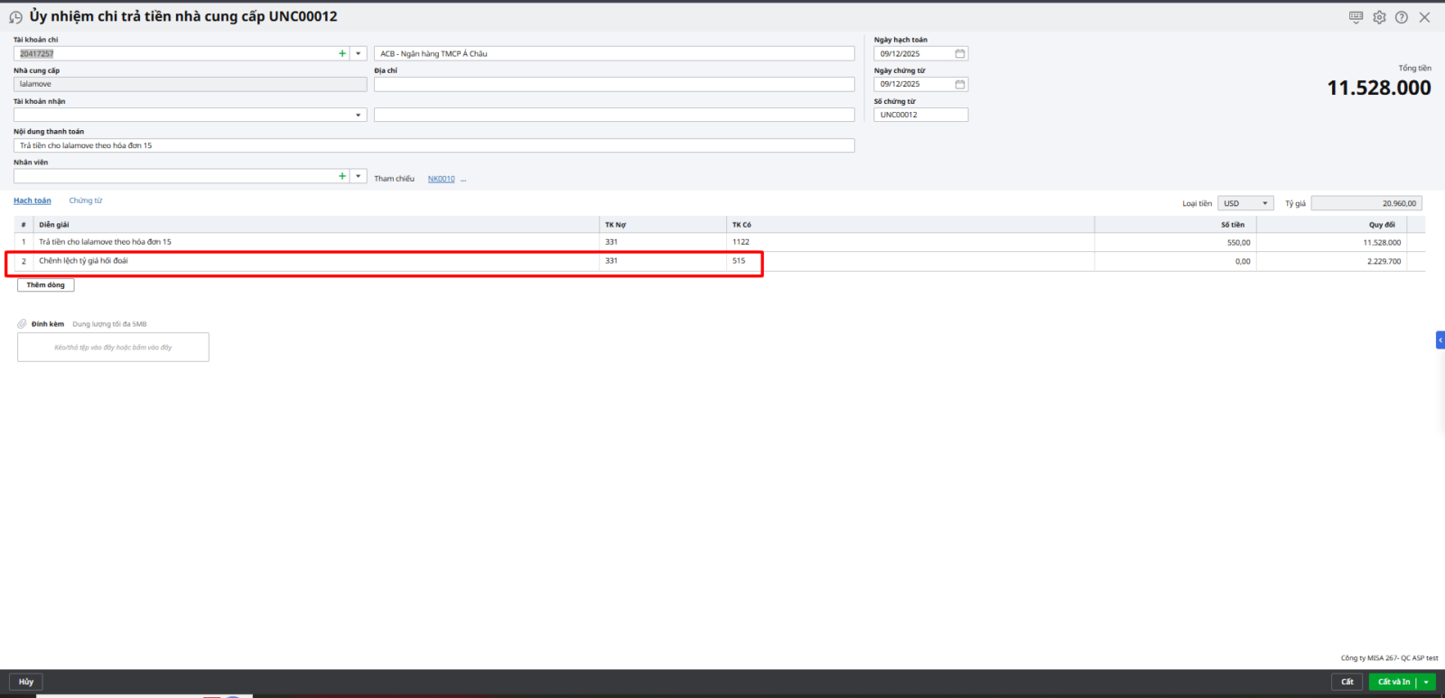 Bước 3: Chương trình sẽ tự động tính tỷ giá xuất quỹ và hạch toán chênh lệch tỷ giá khi ghi sổ chứng từ chi tiền