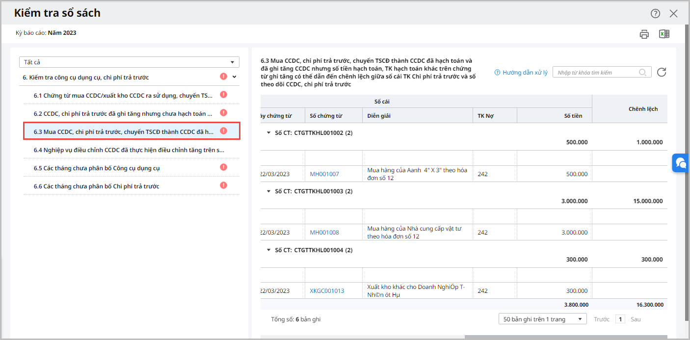 Trường hợp trong kỳ có các chứng từ ghi tăng CCDC/chi phí trả trước có số tiền hạch toán hoặc tài khoản hạch toán khác với chứng từ hạch toán tăng CCDC/chi phí trả trước, chương trình sẽ hiển thị báo cáo chi tiết thể hiện các chứng từ có chênh lệch.