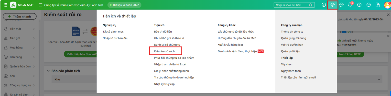 - Cách 1: Vào biểu tượng bánh răng ⚙ Các tiện ích và thiết lập\Kiểm tra sổ sách