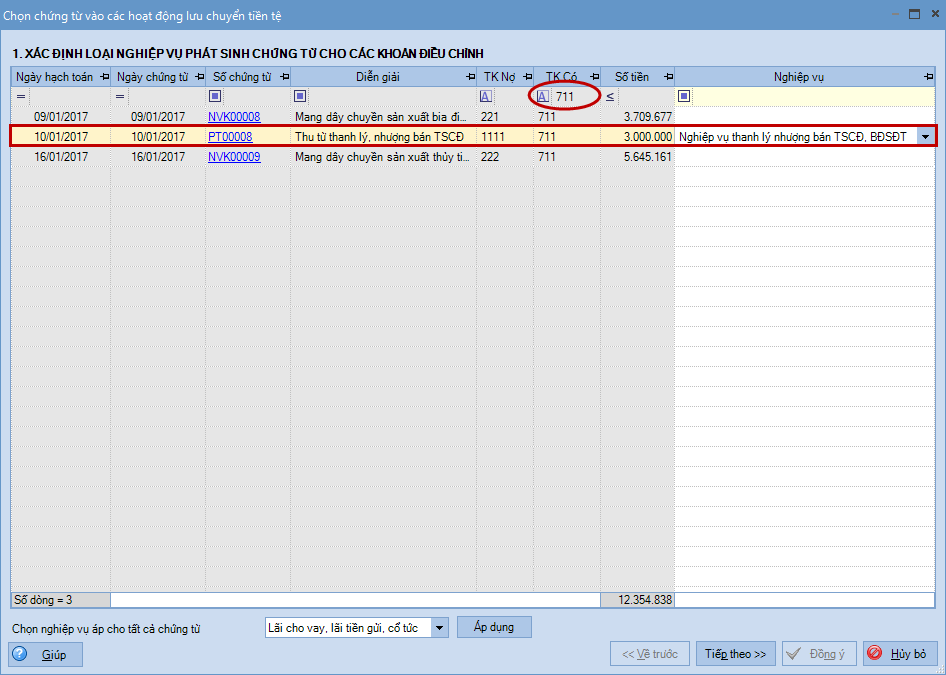 • Lọc TK Có là TK 511, 711 => Chỉ chọn nghiệp vụ cho các chứng từ phản ánh thu nhập từ thanh lý TSCĐ, BĐSĐT.