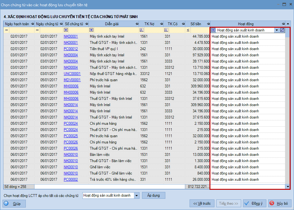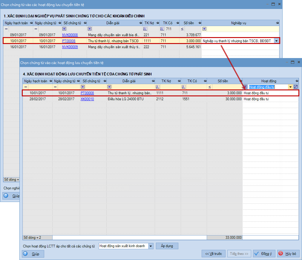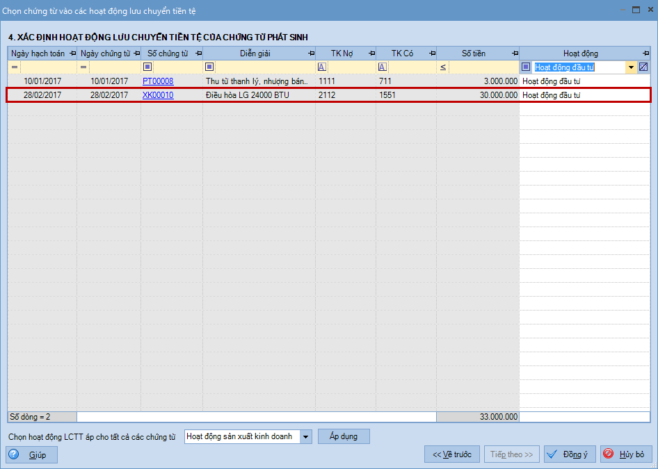 • Tất cả các chứng từ đã được chọn Nghiệp vụ tại bước Xác định loại nghiệp vụ phát sinh chứng từ cho các khoản điều chỉnh khi chuyển sang bước Xác định hoạt động lưu chuyển tiền tệ của chứng từ phát sinh đều được ngầm định chọn là Hoạt động đầu tư.